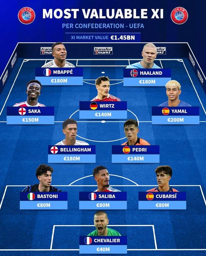 德转列欧洲最贵11人阵容:亚马尔领衔,哈兰德、姆巴佩在列