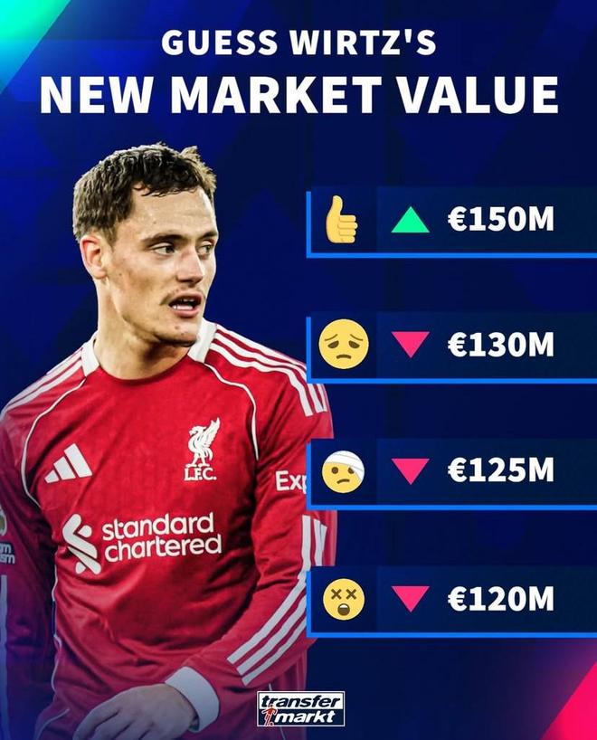 北京时间10月16日,德转预热了利物浦球星维尔茨的身价更新,并给出了四个选项。
