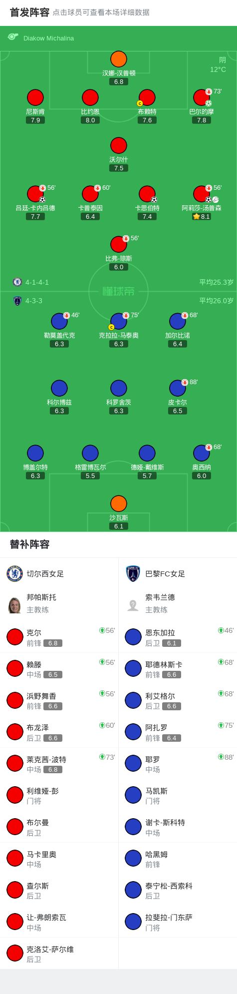 切尔西女足4-0巴黎FC女足,卡思伯特破门,阿莉莎-汤普森传射